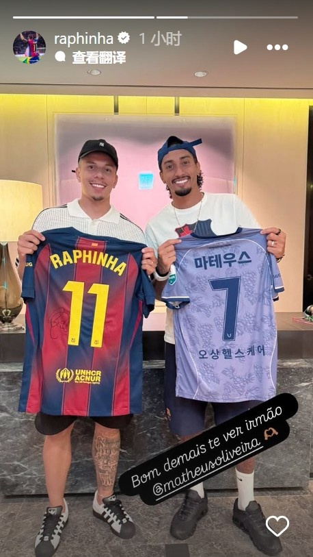 巴萨正在韩国进行季前友谊赛,他们7月31日7-3击败首尔FC。赛后,拉菲尼亚晒出与K1联赛安阳FC球员马修斯-奥利维拉交换球衣的照片,并配文:很高兴见到你,兄弟。