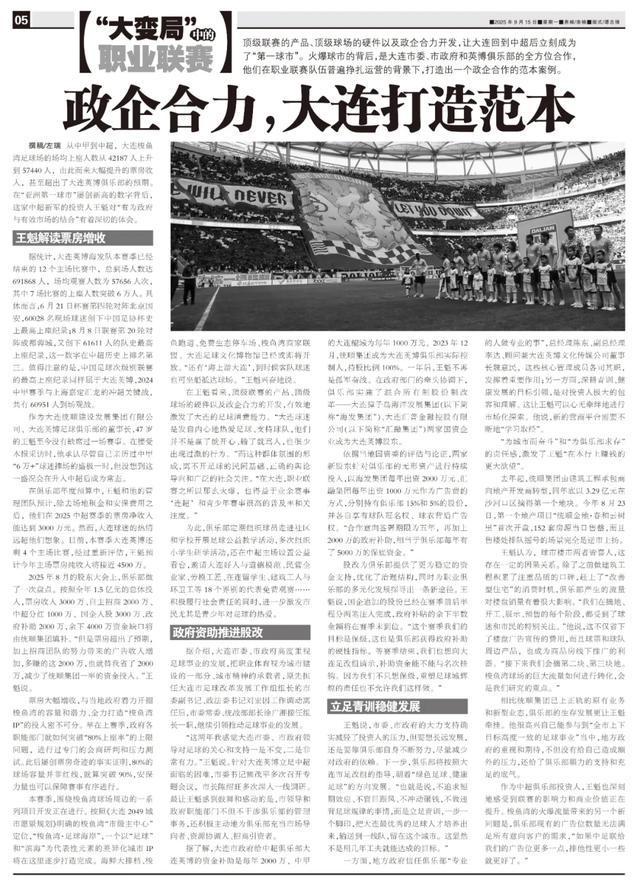 撰稿/左瑞 从中甲到中超,大连梭鱼湾足球场的场均上座人数从42187人上升到57440人,由此而来大幅提升的票房收入,甚至超出了大连英博俱乐部的预期。在“亚洲第一球市”屡创新高的数字背后,这家中超新军的投资人王魁对“有为政府与有效市场的结合”有着深切的体会。