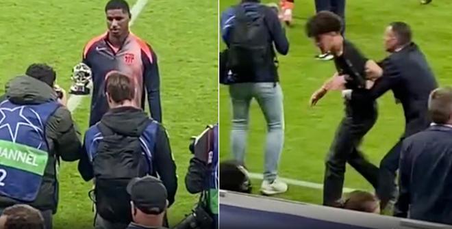 但另一名穿黑色T恤的球迷试图跑向拉什福德和他的队友时,被安保人员强行制止。