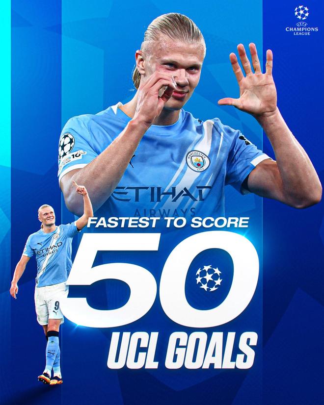 成为欧冠历史最快打进50球的球员,哈兰德社媒发图庆祝