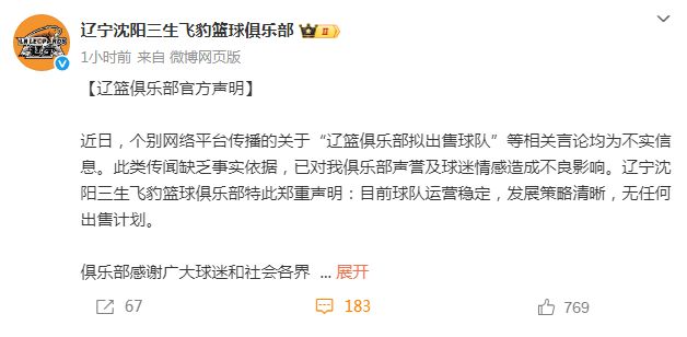 近日,个别网络平台传播的关于“辽篮俱乐部拟出售球队”等相关言论,均为不实信息。此类传闻缺乏事实依据,已对我俱乐部声誉及球迷情感造成不良影响。辽宁沈阳三生飞豹篮球俱乐部特此郑重声明:目前球队运营稳定,发展策略清晰,无任何出售计划。