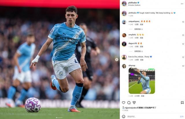 本场比赛曼城遭遇对手最后时刻绝平,首发登场的福登在赛后社媒发文写道:“这是一场艰难的比赛,但我们会继续进步!”