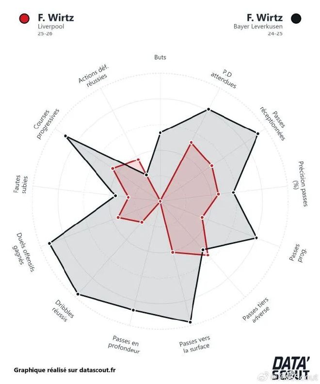 这张雷达图对比了维尔茨在勒沃库森(24/25)与利物浦(25/26)的数据表现。