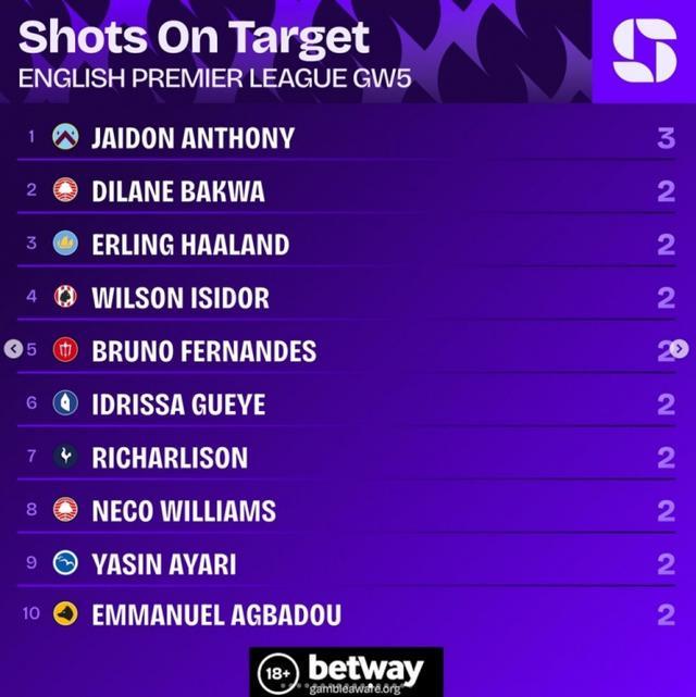 英超第5轮射正榜:杰顿安东尼3次居首,哈兰德等9名球员两次