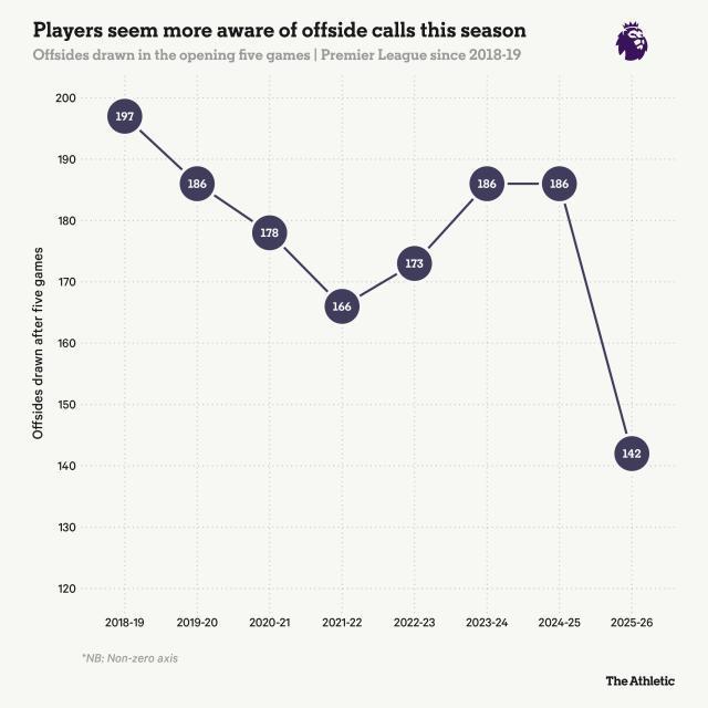 另一个细节是,在半自动越位判定系统引入英超已5个月的情况下,球员们似乎对越位有了更高警惕,本季越位总数对比此前几年显著下跌,只有142次,此前几年多在170-200之间。此中另一成因或许是各队主动或被动减少了直塞球。本季迄今整个英超只有59次成功直塞,也就是平均一场才1.18次,这是2021-22赛季以来的同期最低值。