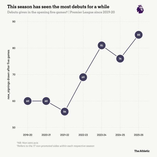 值得注意的是,本季有若干重要球队,包括利物浦、阿森纳、切尔西、纽卡斯尔联和曼联,在进攻线进行了大幅重组,而且很多球员是赛季开打后才加盟。近期比赛,这几支球队的进攻都还不够流畅,明显还在磨合期。排除3支升班马,英超其他17支球队在前5轮共有85名球员上演处子秀,创7年来最高值。这体现了英超今夏引援力度,也预示各队可能随着赛季进行才会打出更好的水平。