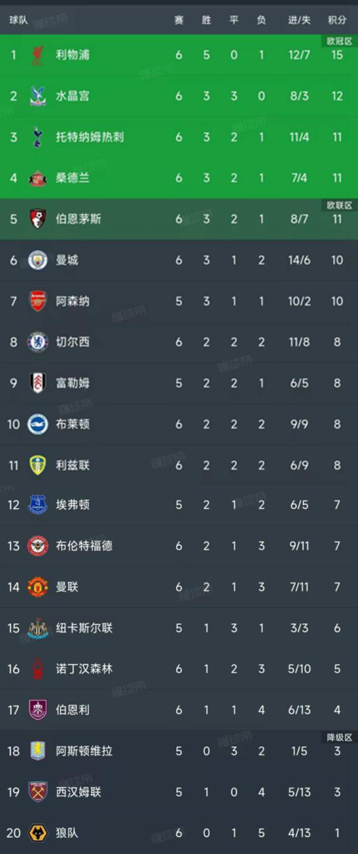 北京时间9月28日,英超第6轮结束了7场比赛,最新积分榜如下!