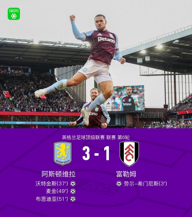 北京时间9月28日英格兰足球顶级联赛 联赛 第6轮,阿斯顿维拉主场对阵富勒姆。阿斯顿维拉沃特金斯破门,麦金破门,布恩迪亚破门。富勒姆劳尔-希门尼斯破门。最终比分阿斯顿维拉 3-1 富勒姆。