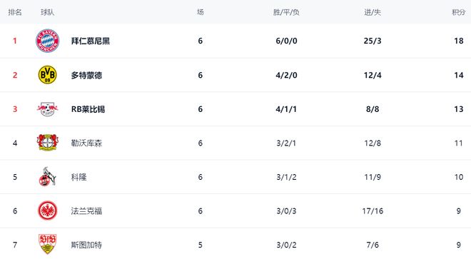 在积分榜上,拜仁6战全胜,以18分高居榜首,独一档的存在。而这轮丢掉2分的多特蒙德则以14分排名第2。莱比锡13分,排名第3。勒沃库森3胜2平1负,拿到11分,排名第4。科隆以10分排名第5。法兰克福和斯图加特都是9分,排名第6和第7。