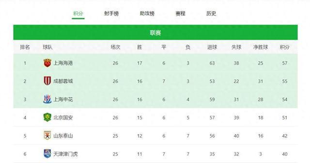 中超第26轮后的积分榜。