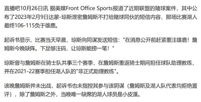 这起震惊篮球界的非法赌博与泄密风波,随着FBI长达多年的调查逐渐浮出水面,10月23日,FBI局长召开新闻发布会,宣布破获NBA涉黑赌博案,共逮捕30多人,其中包括了波特兰拓荒者总教练毕勒普斯、迈阿密热火后卫洛席尔,以及前骑士球员达蒙·琼斯,起诉书揭露了最具争议的事件,2023年2月9日湖人对公鹿比赛,当天早晨,琼斯向赌徒传送讯息:“今晚押密尔瓦基,大注”,他明确告知同谋詹姆斯将缺席比赛,而那时官方伤病名单尚未公布这一信息