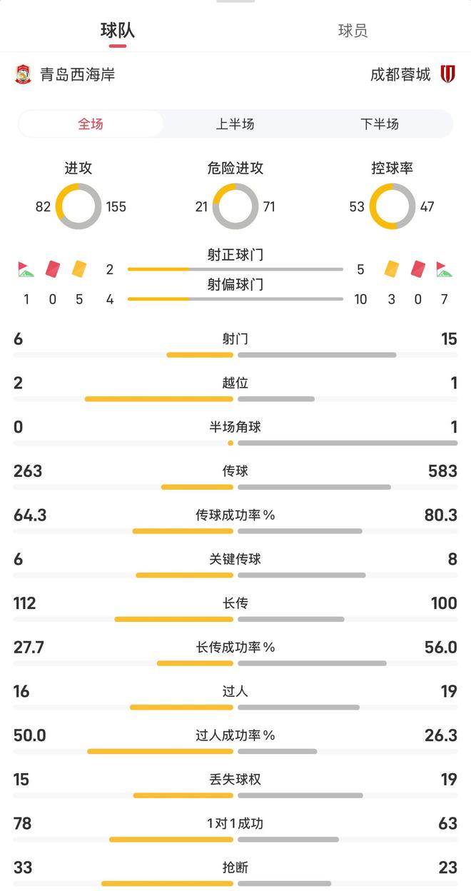 - 中超 | 西海岸vs蓉城全场数据:射门615,控球率53%47%