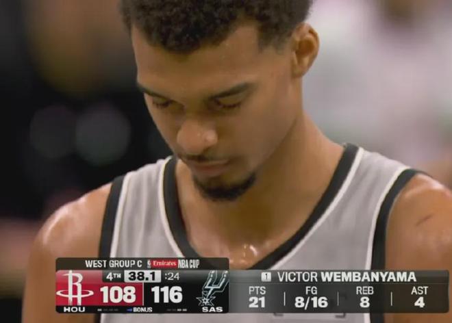 今天火箭以110比121输给马刺,但他们把文班亚马防成了16投8中“仅得”22分8篮板4助攻。