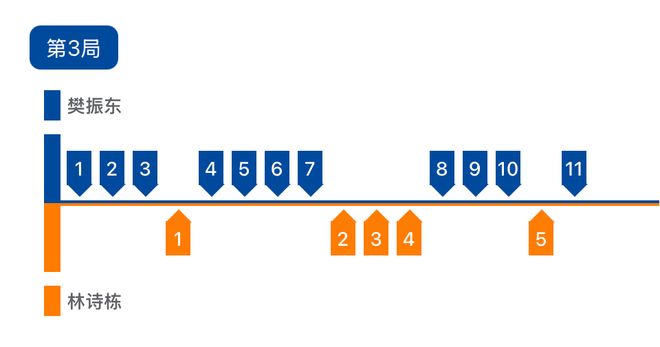 第二局较量,樊振东3比0开局,林诗栋不甘示弱连下三分。此后双方比分交替上升,在这一局一些关键球处理上,林诗栋略胜一筹,11比8,双方大比分1比1平。