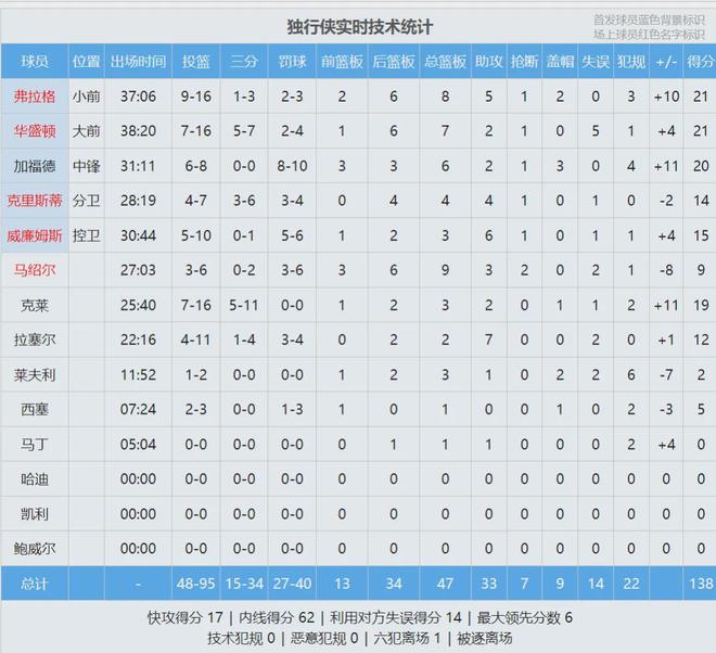 独行侠状元弗拉格首发出战37分钟,16投9中,三分3中1,罚球3中2,拿到21分8篮板5助攻1抢断2盖帽,正负值+10全场第三。克莱替补出战25分钟,投篮16中7,三分11中5,拿到19分3篮板2助攻1盖帽,正负值+11并列全场最高。