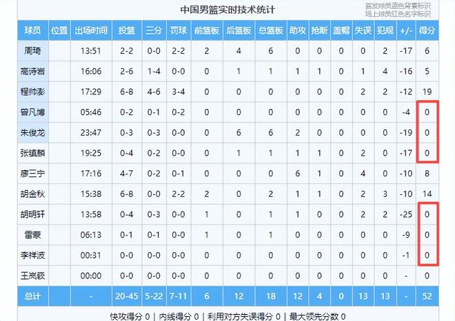 还有雷打不动的国手,历届主教练都喜欢用的朱俊龙,两场都拉胯,不是说你防守端牛逼吗?可是两场也防不住人,不但防守不行,进攻也不行,大空位三分居然投出三不沾,被解说嘉宾陈正昊嘲笑,全场打了最多的32分钟,4投0中,他和胡明轩一样也是靠罚球得了2分,两战怒砍4分。