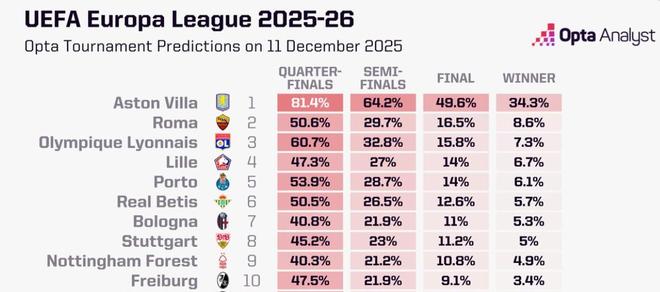北京时间12月11日,知名数据机构Opta的超级电脑预测了本赛季欧联杯参赛球队的成绩,阿斯顿维拉以34.3%的夺冠概率高居第一,罗马8.6%位列第二,里昂7.3%排名第三。