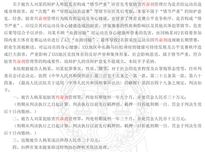 法院的判词还写到:杨明、刘宝的行为导致运动员被长期禁赛、断送职业生涯,对运动员身心健康、公平公正竞赛秩序及体育科研队伍风气均造成了巨大损害,严重影响田径项目持续发展,社会影响极其恶劣。