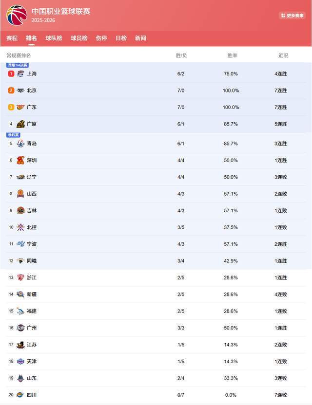 - CBA | CBA排名榜:北京、广东双双7连胜,山东3连败+新疆4连败皆倒数
